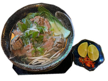 traditionelle Pho-Suppe mit dünnen Rindfleischscheiben, frischem Koriander, Lauchzwiebeln und Sojasprossen in Rinderkraftbrühe